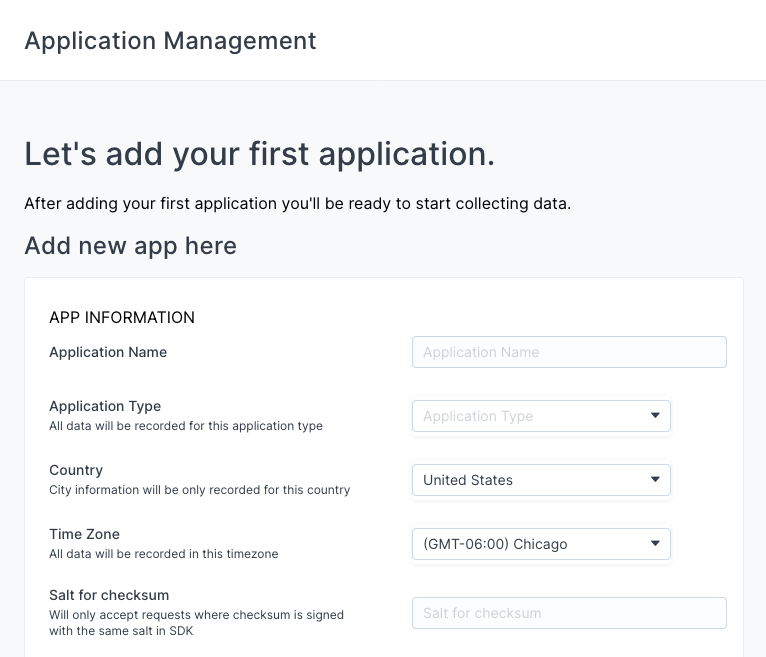 Submitting the form to create your administrator account automatically directs you to a page to create a new application for your Countly instance. Here, you are entering the name and some descriptive information about the application.