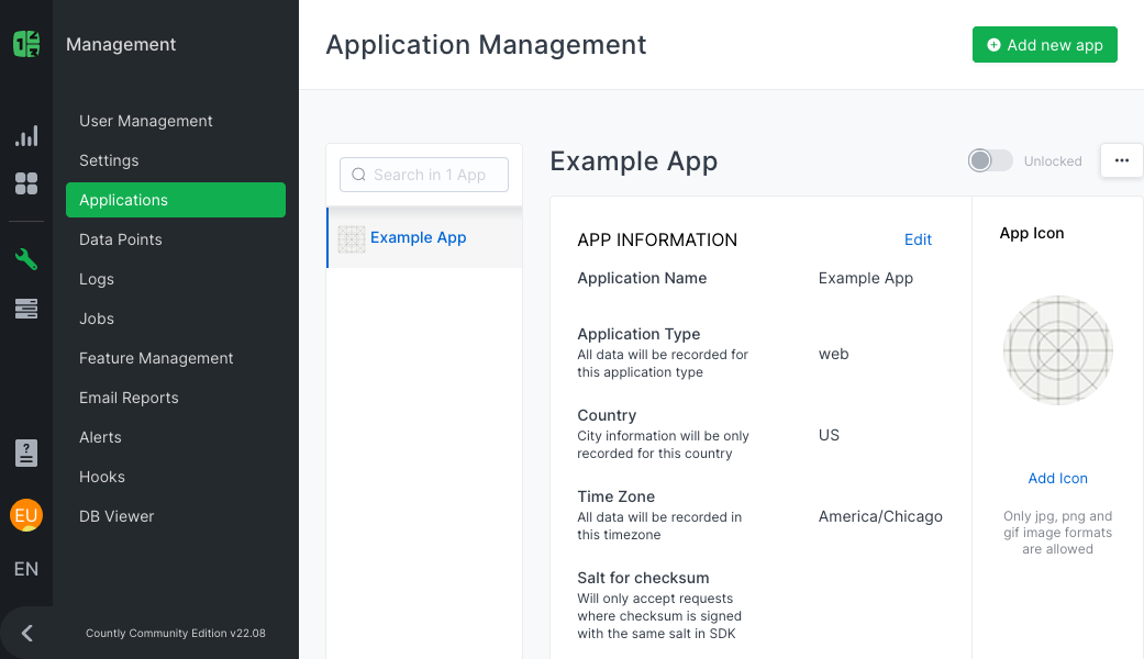 With your Countly instance up and running, you are ready to start setting it up for use. This next series of sections first covers the initial setup within the Countly interface.