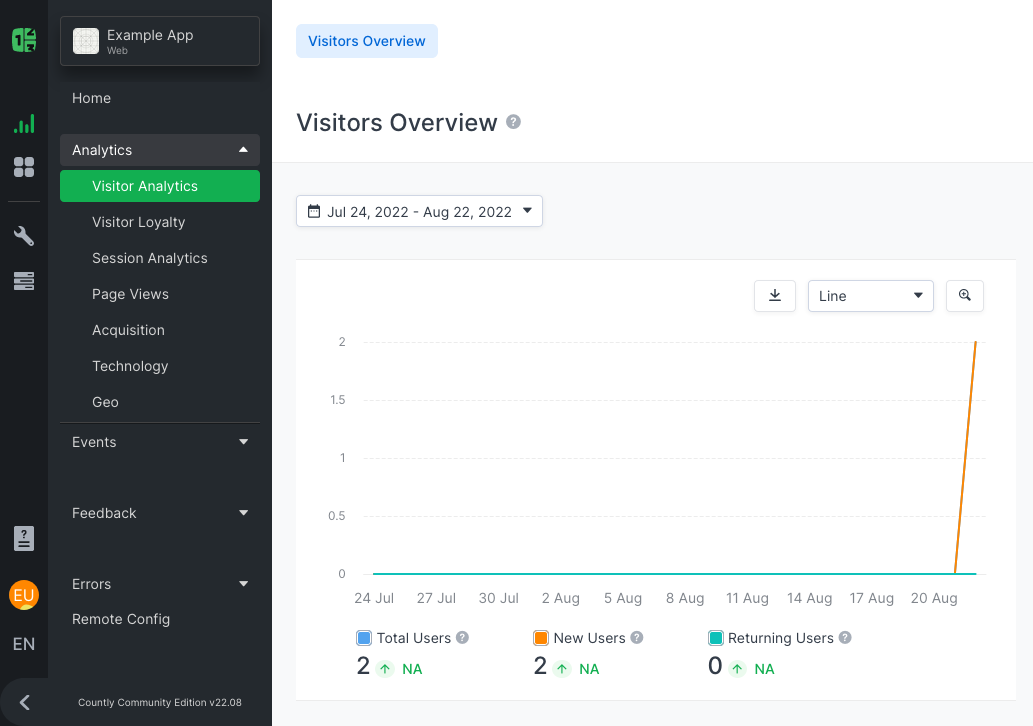 Here, you can survey the analytics generated by your Countly instance and manage all aspects of your Countly operations. You can navigate between and create application entries, and within each, view analytics for visits, events, and more.